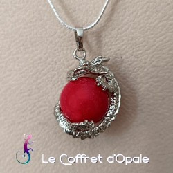 Très beau pendentif original en métal plaqué argent représentant un dragon tenant entre ses pattes une grosse perle en jade rouge.