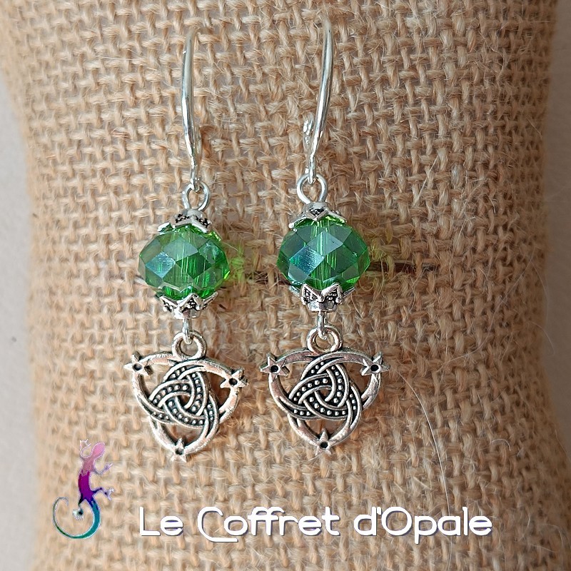 Boucles d'oreilles pendantes originales en métal plaqué argent, perle en cristal facetté vert et pendentif triskell argenté antique.