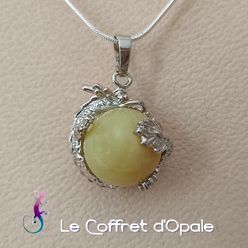 Très beau pendentif original en métal plaqué argent représentant un dragon tenant entre ses pattes une grosse perle en jade jaune.