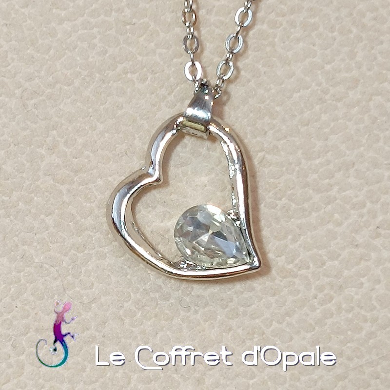 Chaine et pendentif cœur en métal argenté avec goutte en cristal blanc.