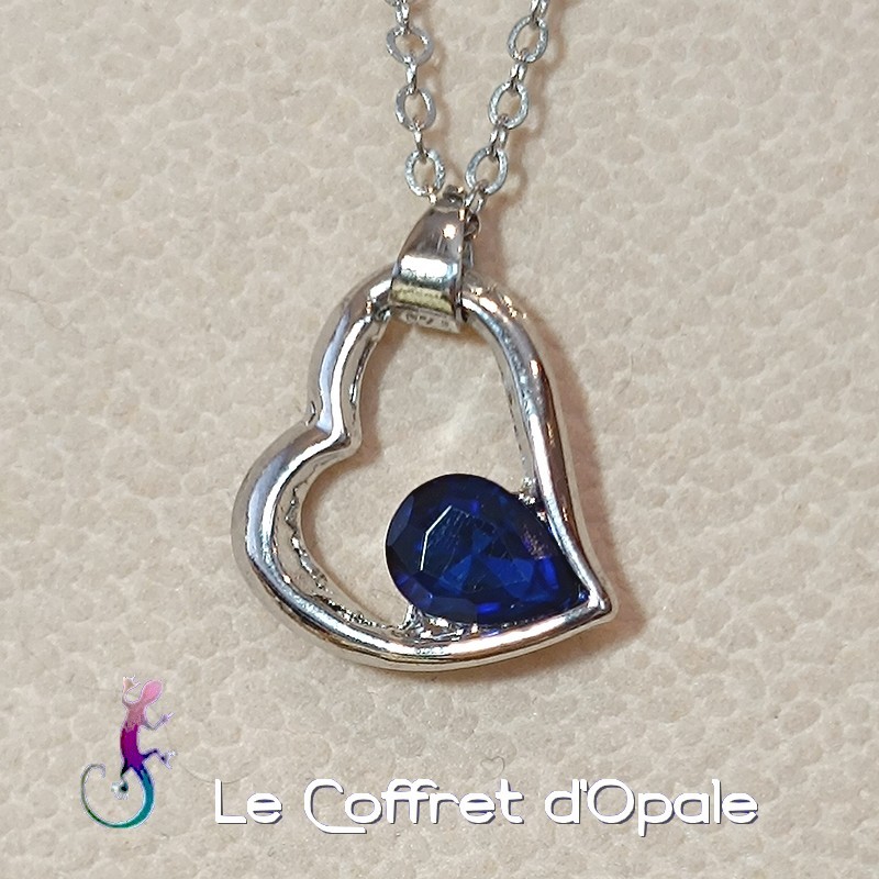 Chaine et pendentif cœur en métal argenté avec goutte en cristal bleu.