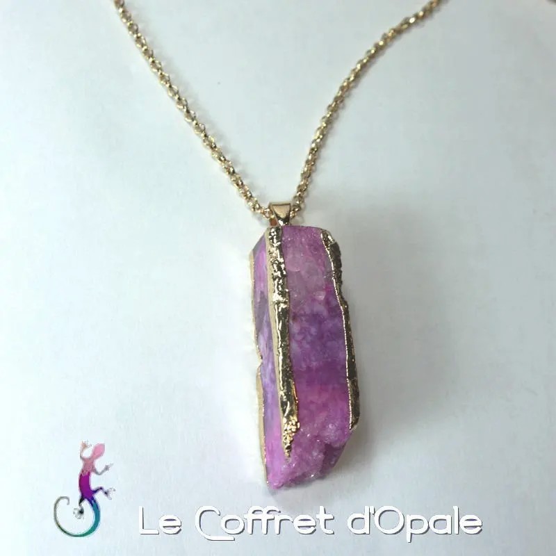 Collier avec pendentif géode en quartz teinté rose bordures dorées  et chaîne dorée avec fermoir mousqueton.
