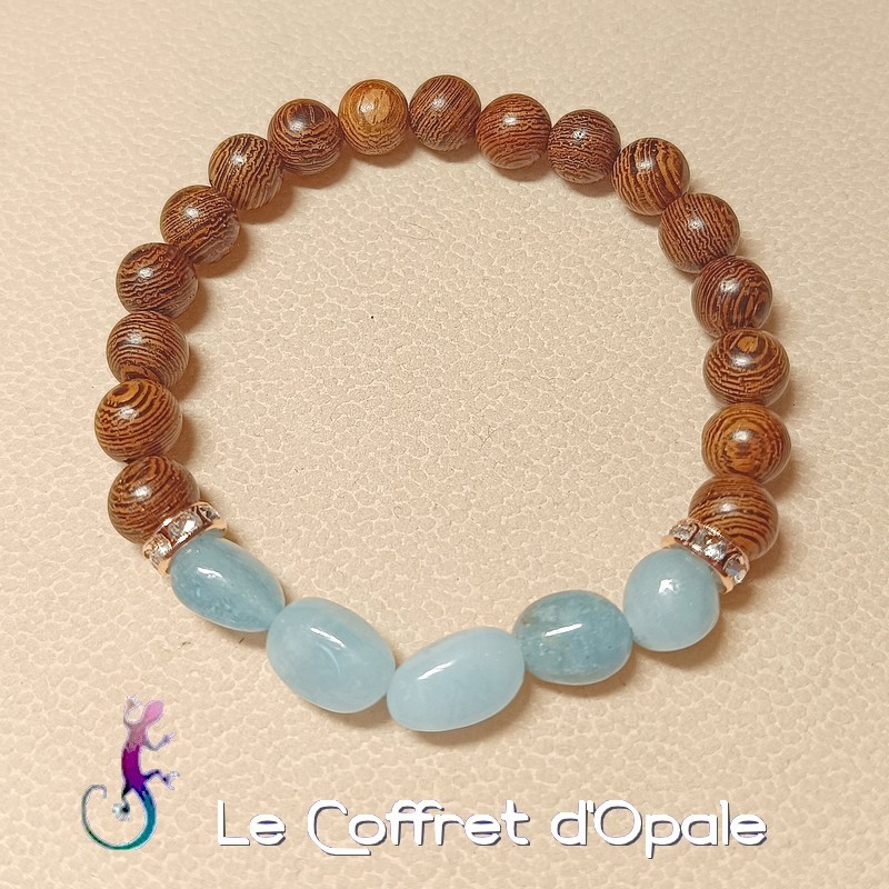 Joli bracelet en nuggets d'aigue-marine et perles rondes en bois exotique wengé, monté sur élastique.