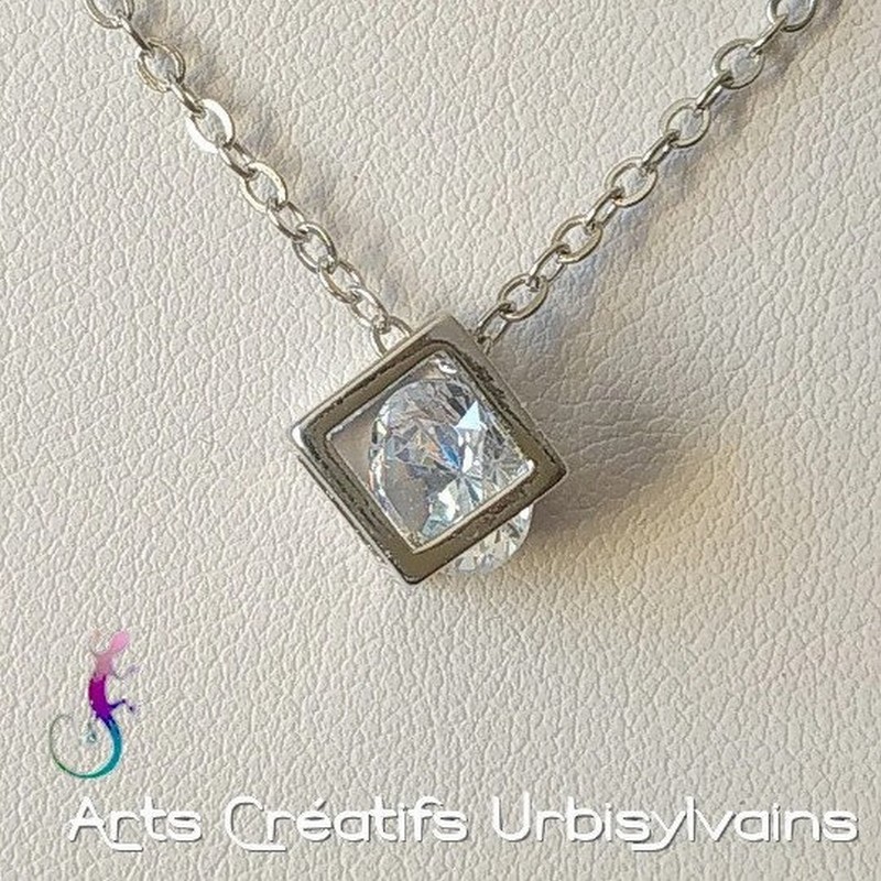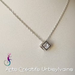 Chaine argentée et pendentif avec un cristal blanc en zircon dans un cube en métal argenté.
