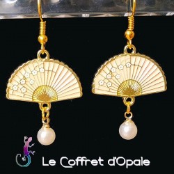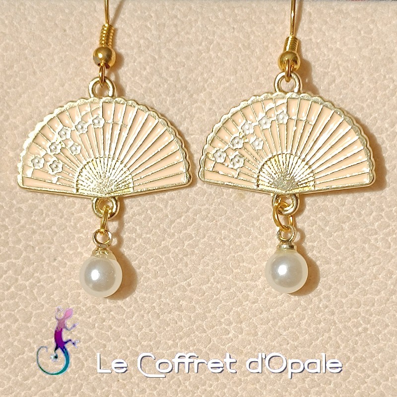 Boucles d'oreilles originales en métal doré, éventails en émail cloisonné rose et blanc, pendentif perle en verre.
