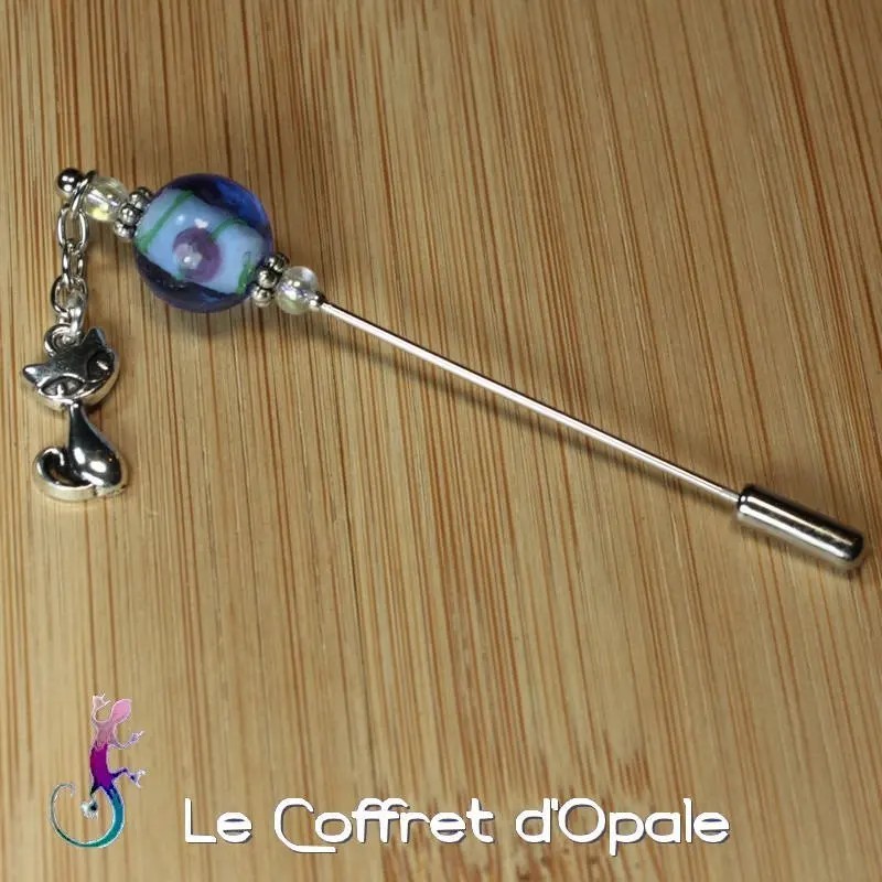 Belle fibule décorative avec perle de verre originale et pendentif chat en métal argenté.