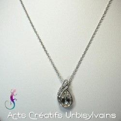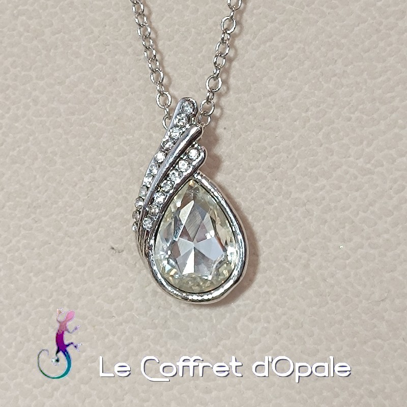 Chaine et pendentif plaqué argent avec goutte en cristal blanc avec inclusion de cristaux blancs en bordure.