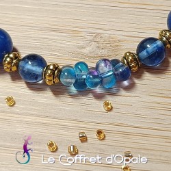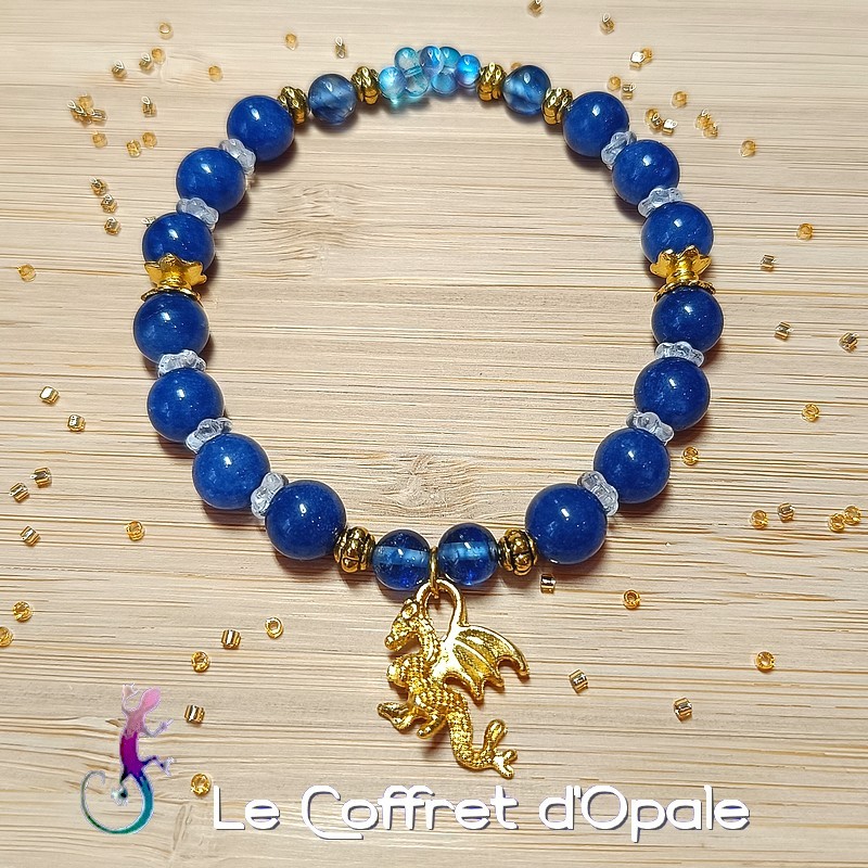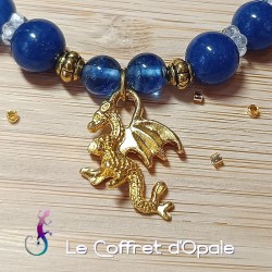 Bracelet en perles naturelles de cyanite et tourmaline bleue, perles intercalaires dorées ou en verre avec un pendentif dragon 3D en métal doré. Il est monté sur un fil élastique. Ce bracelet original est unique par sa composition.