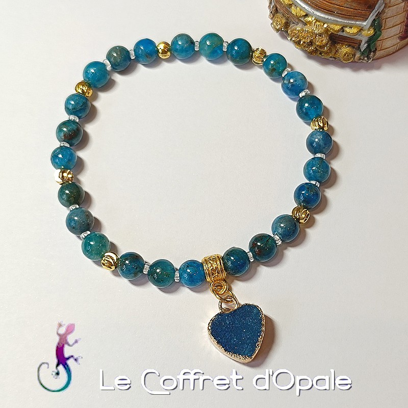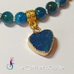 Bracelet original en perles naturelles d'apatite orné d'une géode en forme de cœur et perles intercalaires en métal doré, monté sur fil élastique.