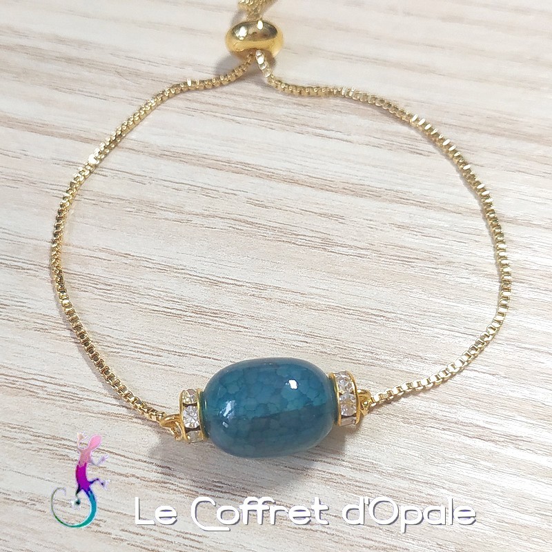 Bracelet élégant et minimaliste orné d'une pierre d'agate bleu foncé en forme d'olive et de rondelles de strass blancs, montés sur une chaîne réglable en métal dorée de section carrée.
