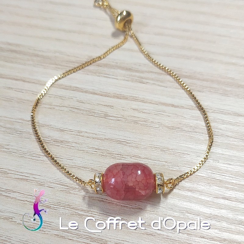 Bracelet élégant et minimaliste orné d'une pierre d'agate vieux rose en forme d'olive et de rondelles de strass blancs, montés sur une chaîne réglable en métal dorée de section carrée.