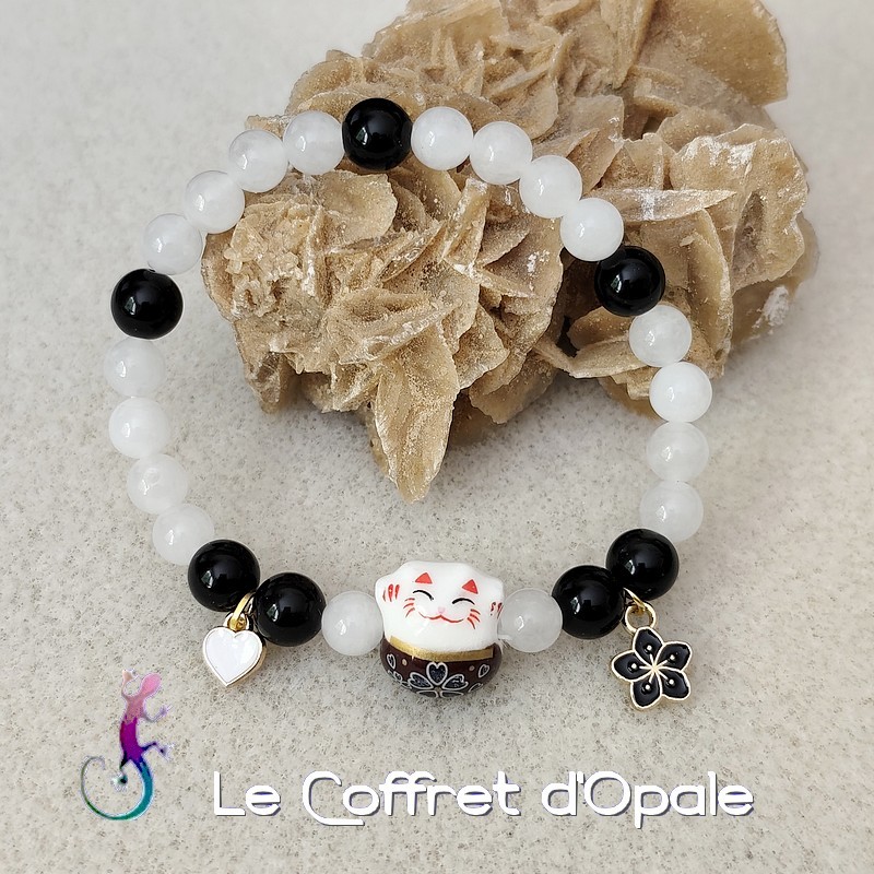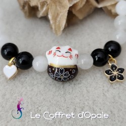 Bracelet original représentant un chat japonais porte-bonheur en céramique et composé de perles rondes en jade blanc et en obsidienne. Il est orné d'une breloque cœur et d'une breloque fleur en émail cloisonné. Ce bracelet est monté sur un double fil élastique.