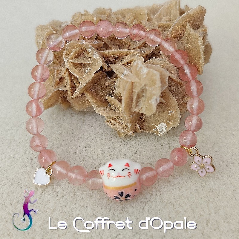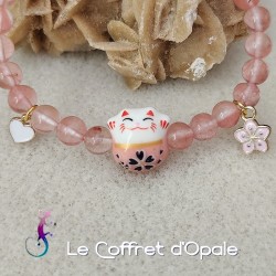 Bracelet original représentant un chat japonais porte-bonheur en céramique et composé de perles rondes de tourmaline pastèque. Il est orné d'une breloque cœur et d'une breloque fleur en émail cloisonné. Ce bracelet est monté sur un double fil élastique.