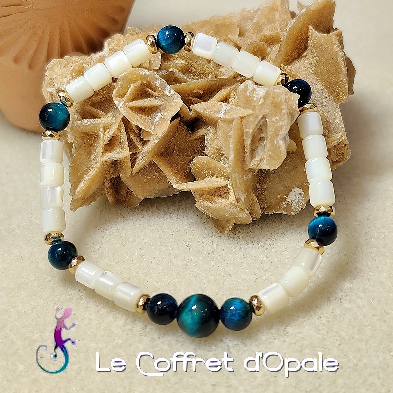 Elégant bracelet en perles cylindriques de nacre blanche naturelle et en perles rondes d'œil de tigre turquoise. Il est orné de petites perles intercalaires facettées en métal doré. Ce bracelet est monté sur un double fil élastique.