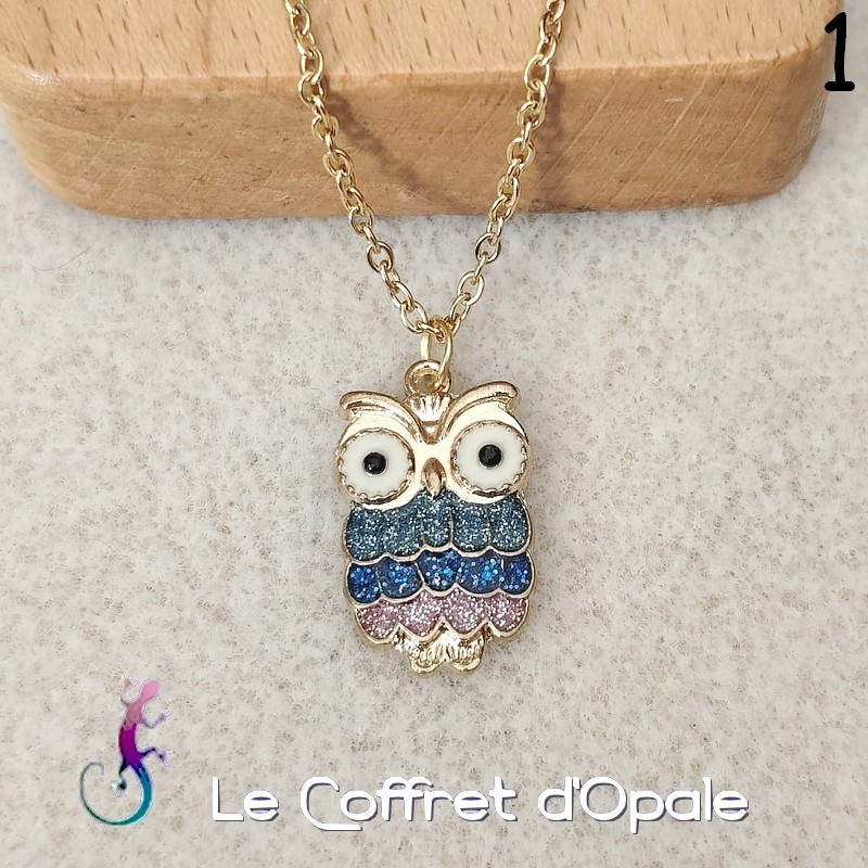 Chaîne en acier inoxydable dorée orné d'un pendentif Hibou réalisé en émail cloisonné et monté sur une base en métal plaqué doré. Deux couleurs au choix.