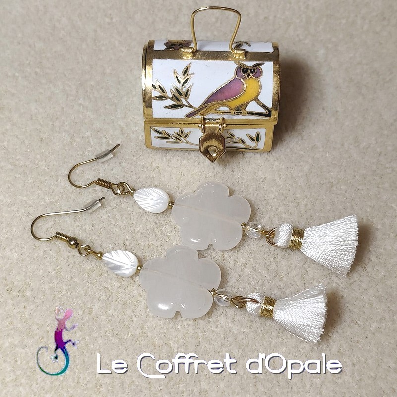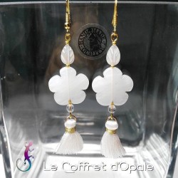 Boucles d'oreilles originales en métal doré, avec perles fleur en quartz blanc, feuilles en nacre et pompons blancs et dorés en soie.